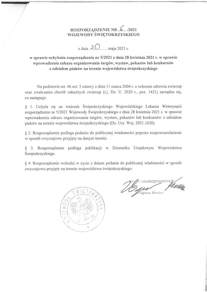 Rozporządzenie Nr 6 Wojewody Świętokrzyskiego z dnia 20 maja 2021 dot. uchylenia zakazu organizowania targów, wystaw, pokazów lub konkursów z udziałem ptaków na terenie województwa świętokrzyskiego.
