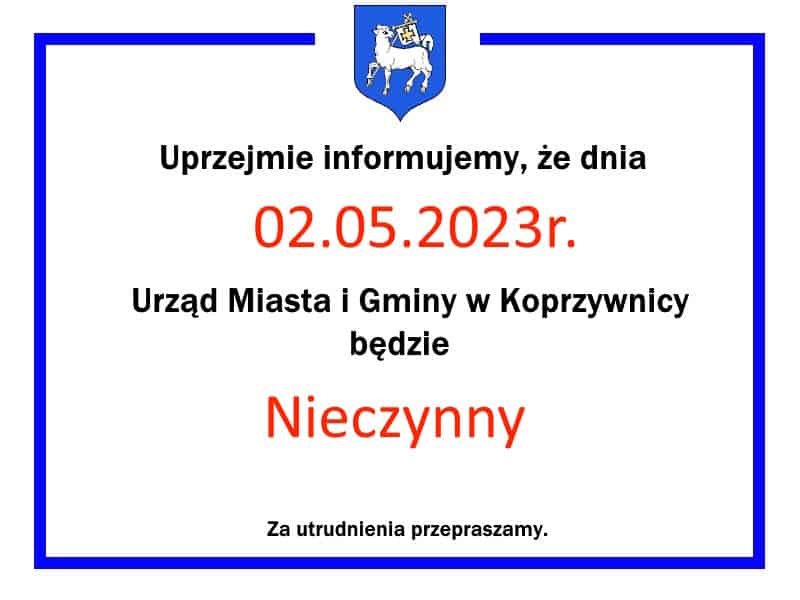 Informujemy, że 2 maja 2023r. Urząd Miasta i Gminy w Koprzywnicy będzie nieczynny.