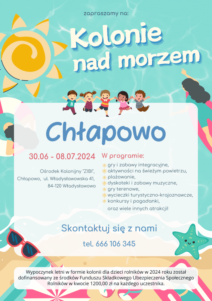 Turnus I: Ośrodek Wczasowo-Kolonijny „ZIBI I”, ul. Władysławowska 41, 84-120 Chłapowo w terminie 30.06-08.07.2024