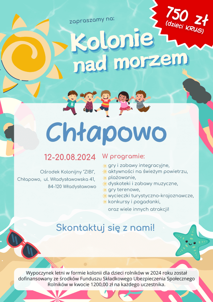 Wypoczynek letni w formie kolonii dla dzieci rolników w 2024 roku jest dofinansowany ze środków Funduszu Składkowego Ubezpieczenia Społecznego Rolników w kwocie 1200,00 zł na każdego uczestnika.
