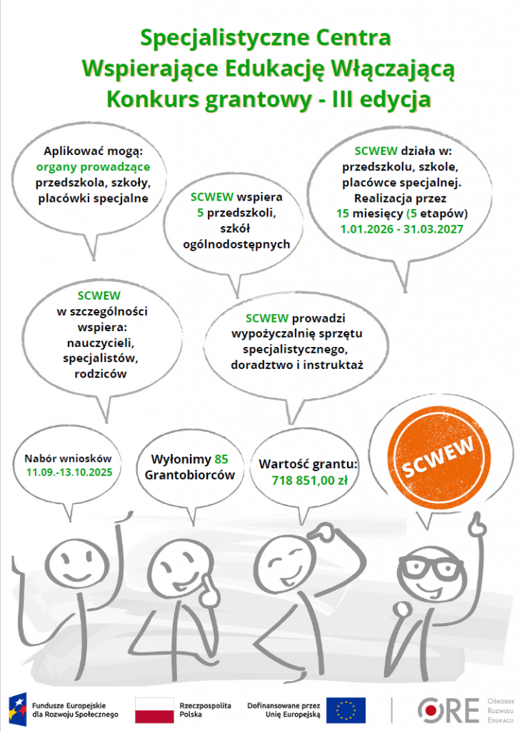Ośrodek Rozwoju Edukacji 9 września 2025 r. ogłosił III edycję konkursu grantowego w ramach projektu „Budowa skoordynowanego systemu pomocy specjalistycznej opartego na Specjalistycznych Centrach Wspierających Edukację Włączającą” (SCWEW).