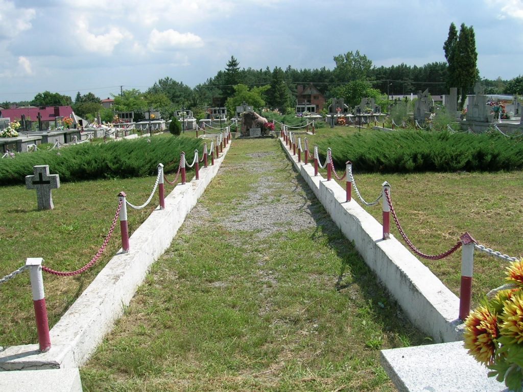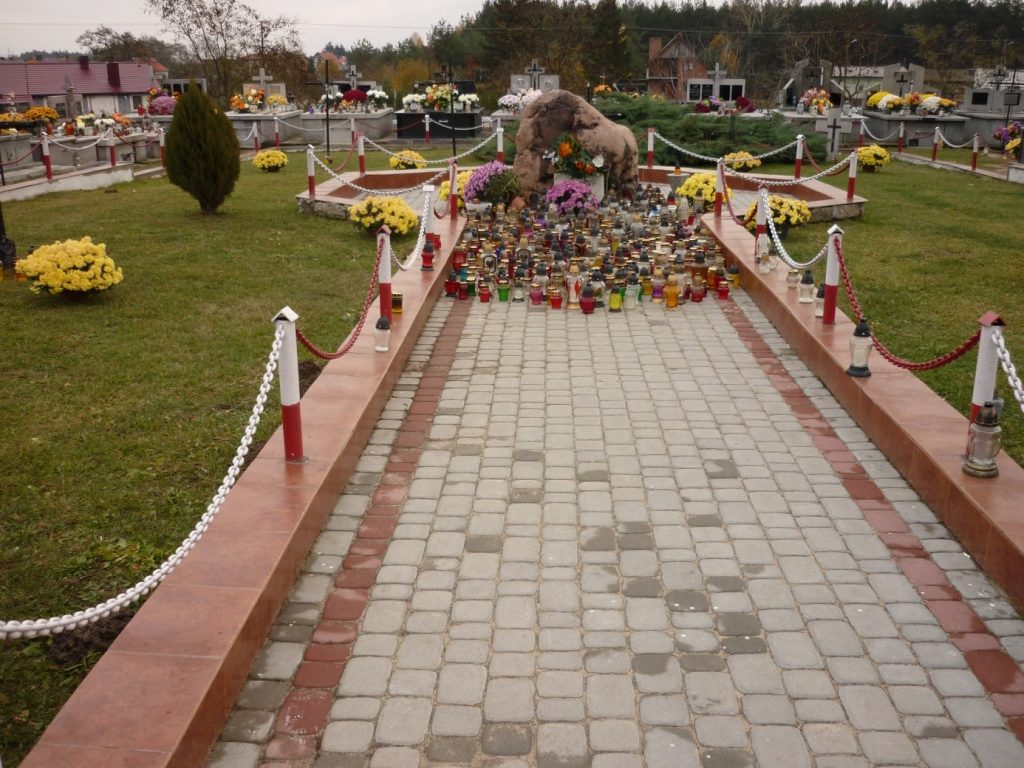 – MOGIŁA ZBIOROWA– mogiła obsiana trawą, wokół mogiły murek, na nim wmontowane granitowe słupki pomiędzy nimi łańcuch, kamień, a na nim granitowa tablica z godłem i napis: