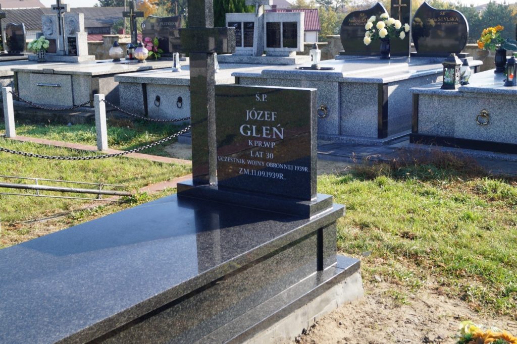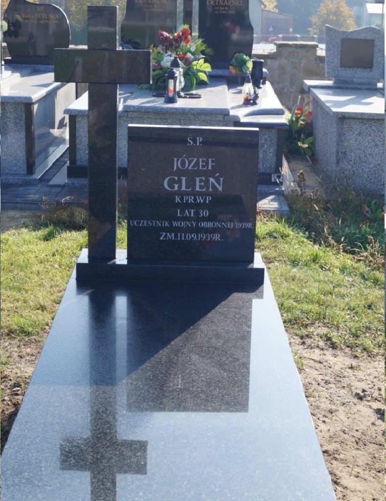 „BÓG HONOR OJCZYZNA TU SPOCZYWA ŻOŁNIERZ POLSKI KPR. JÓZEF GLEŃ WALCZĄCY O WOLNOŚĆ W WOJNIE 1939 r. UR. DNIA 05.12.1908 r. ZM. DN.11.09.1939 r. POKÓJ JEGO PAMIĘCI”