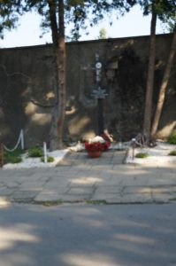 PŁYTA LASTRYKOWA – Płyta pionowa, ustawiona pod niewielkim katem, na niedużym podwyższeniu imitującym płytę nagrobną, na płycie metalowy krzyż, obok przymocowana czarna tablica z inskrypcją.
